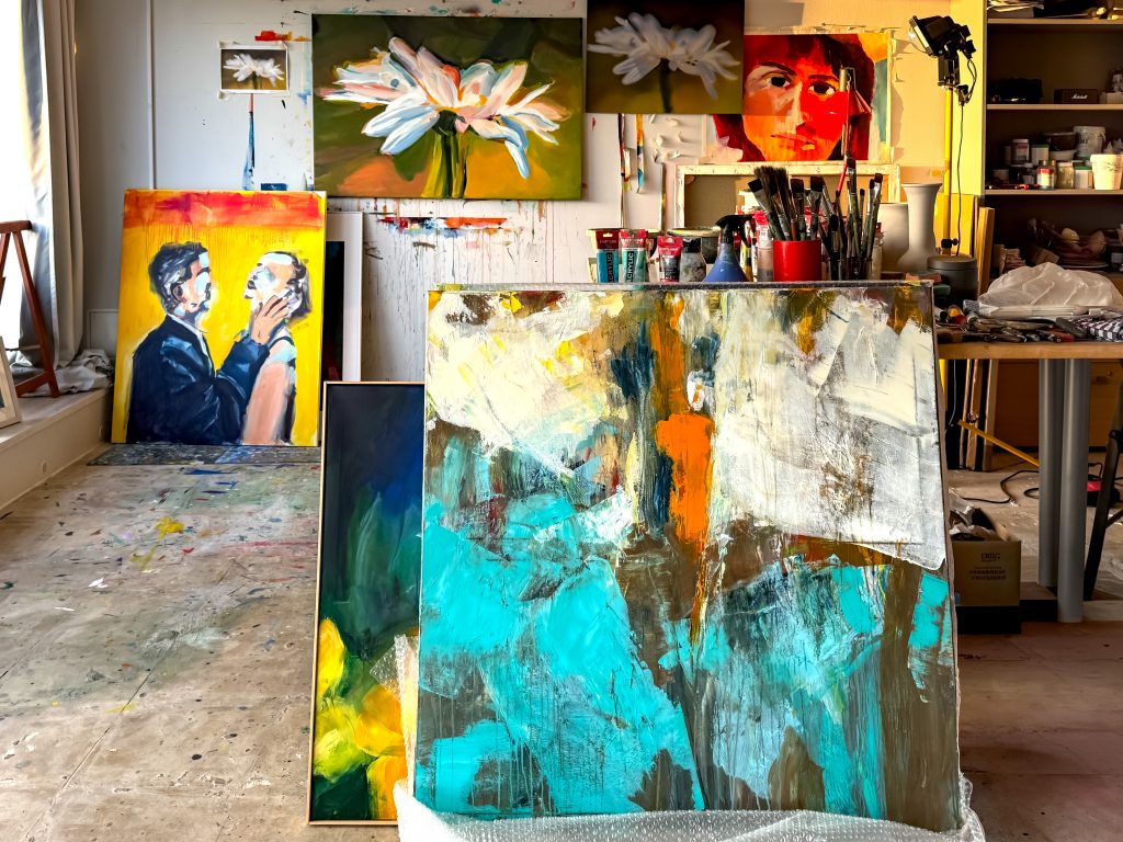 Farben stehen in Gruppen. Tuben stehen aufrecht. Leinwände sind startklar. Frisch getöpferte Vasen warten auf ihre Bemalung. Ein riesengroßes Durcheinander, doch hier schlägt das Herz von: Farbe berührt